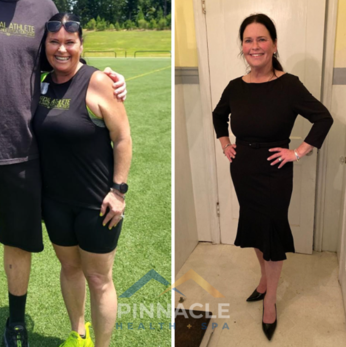 Then, she tried Sema Shots at Pinnacle Health Spa, and it all turned around! When she first started, she weighed 180 pounds and now, she's down to 129!! She's lost 51 pounds and went from a size 14 pant size to a size 6 (and she's maintaining this size and keeping the weight off!!).